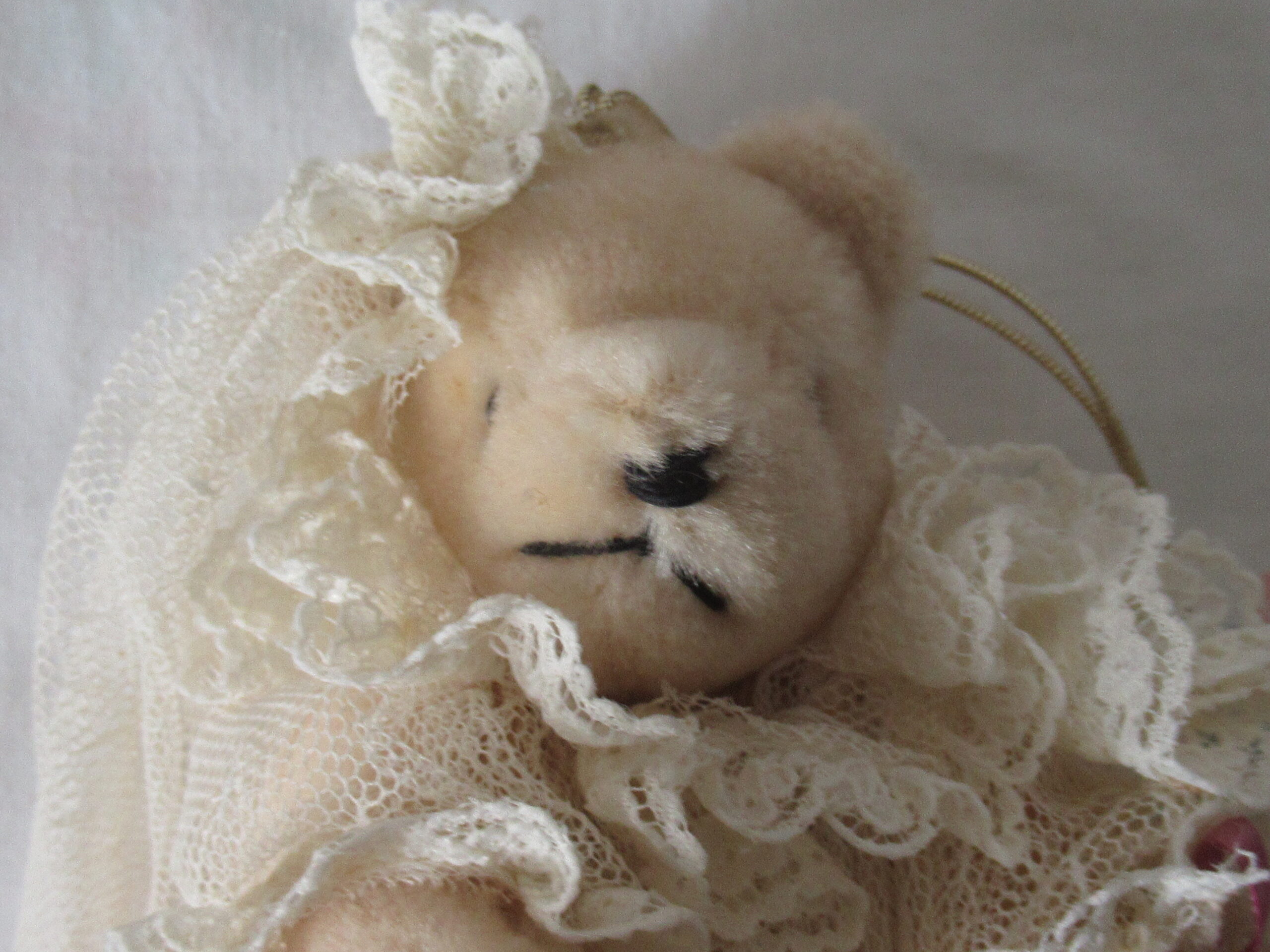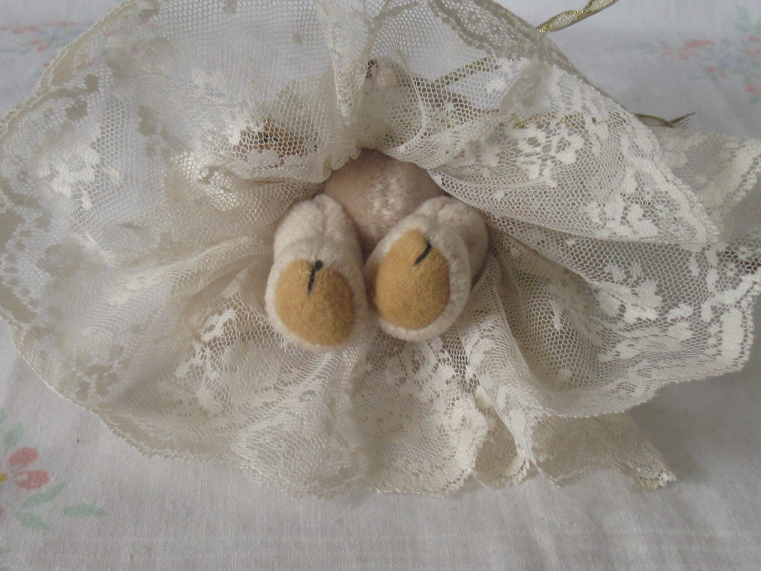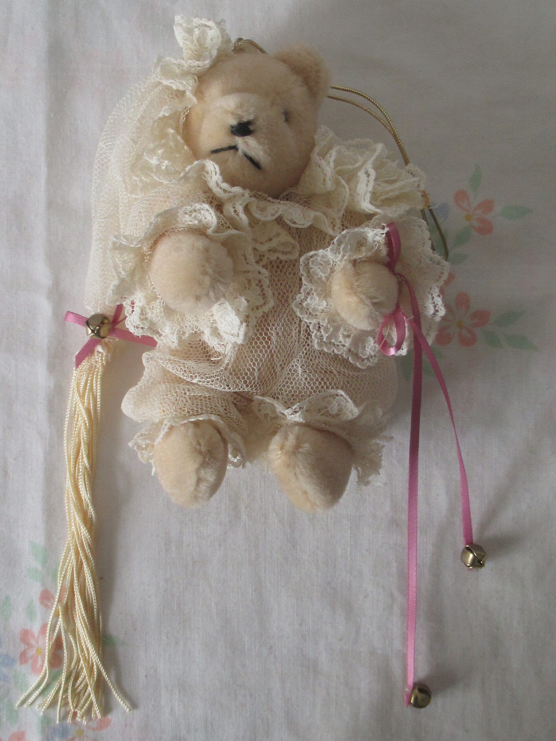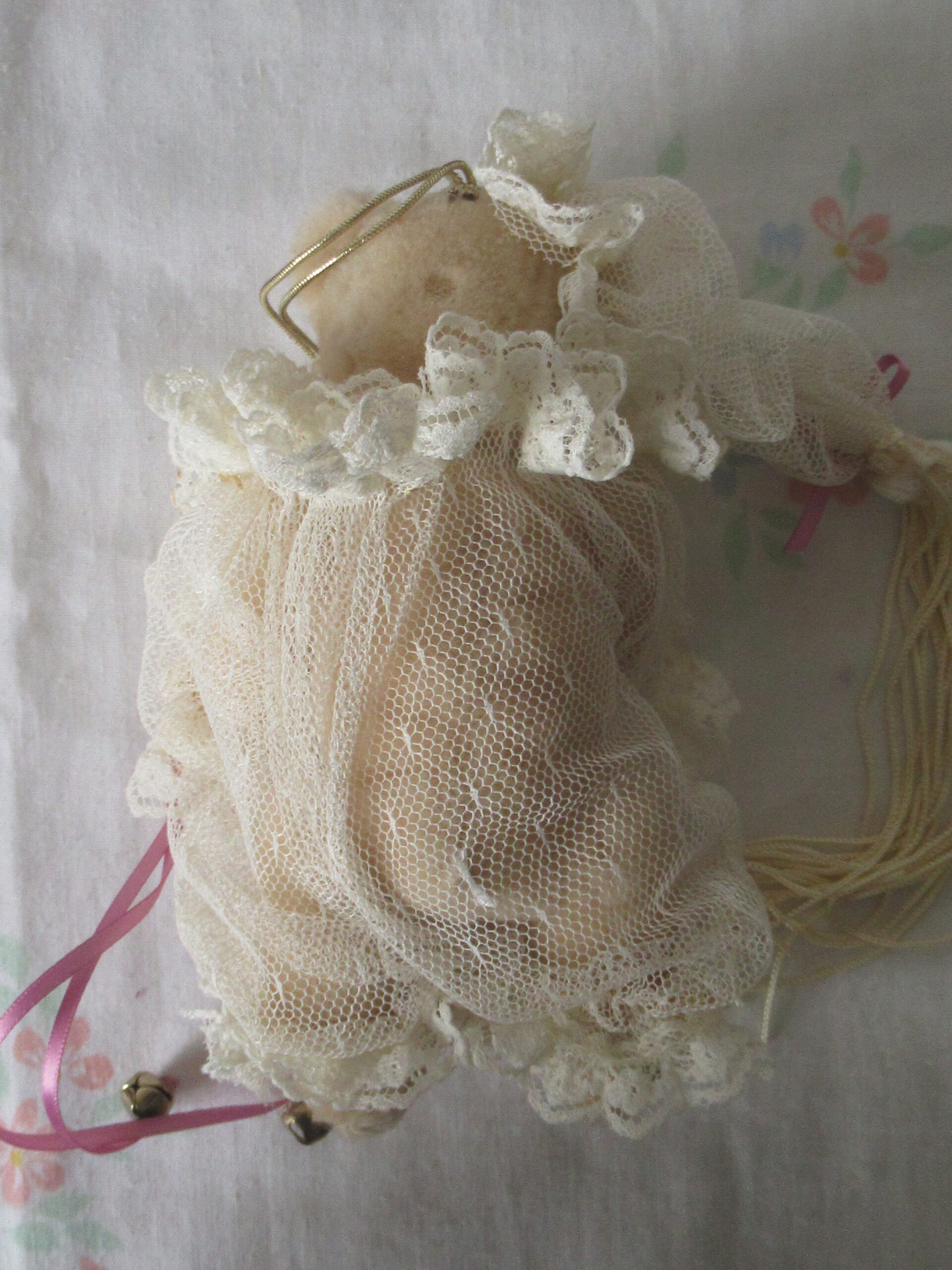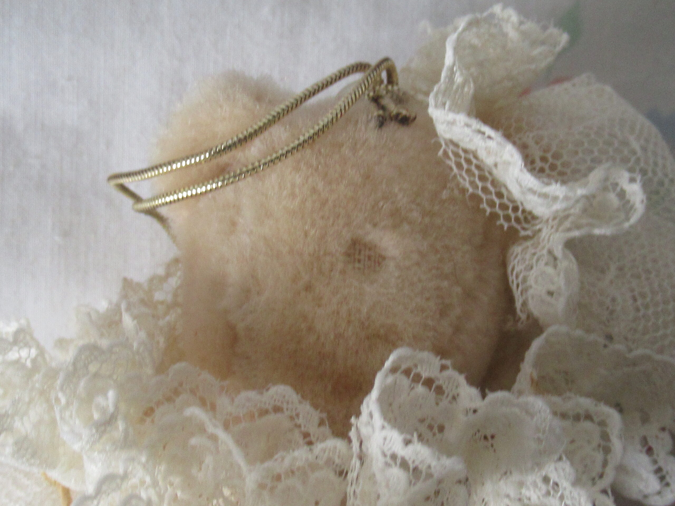 Bear has hanging string attached to head. Head has indentations on rear. Lace appears discolored and elastic is stretched and dried out, especially around neck.