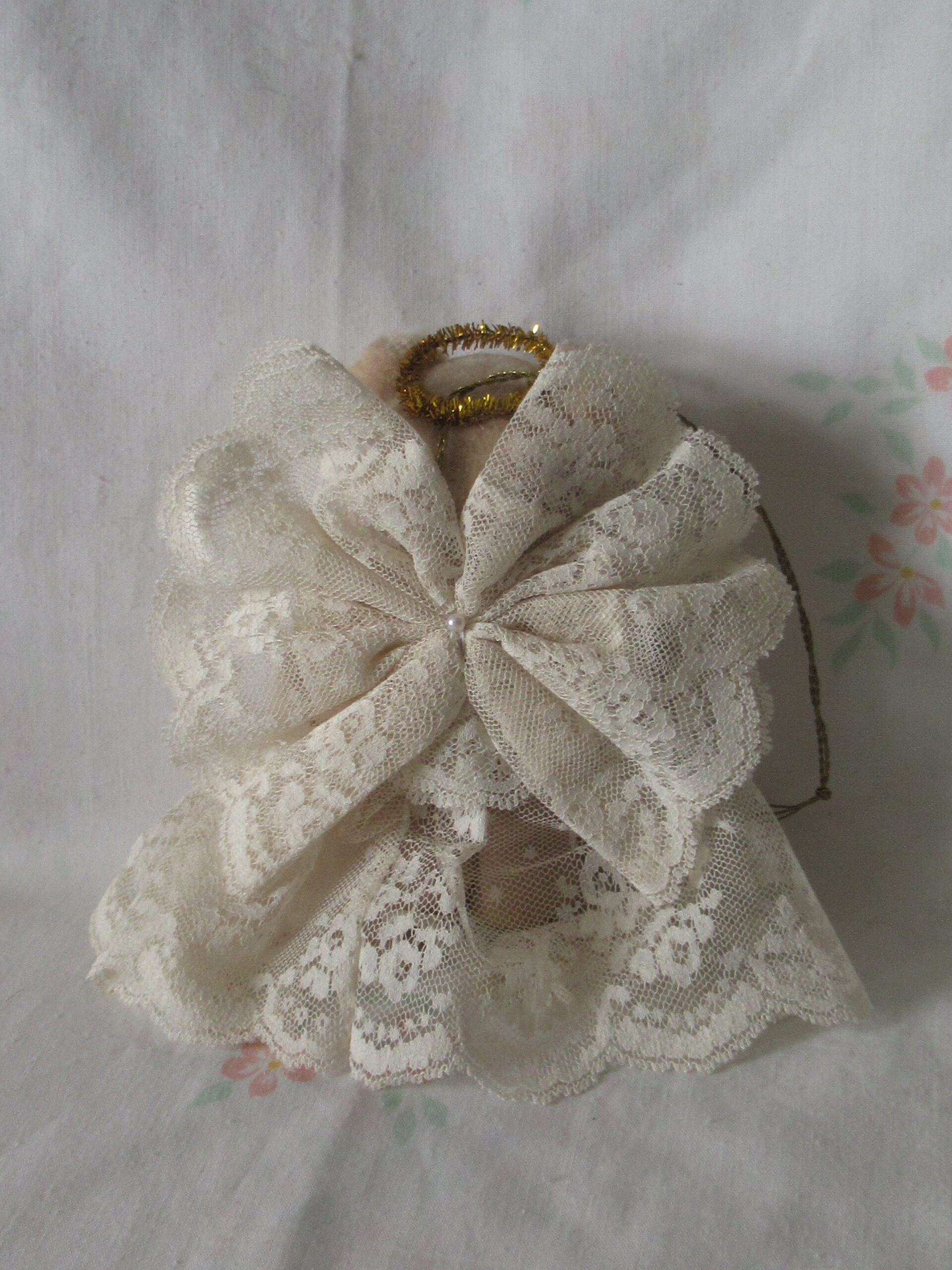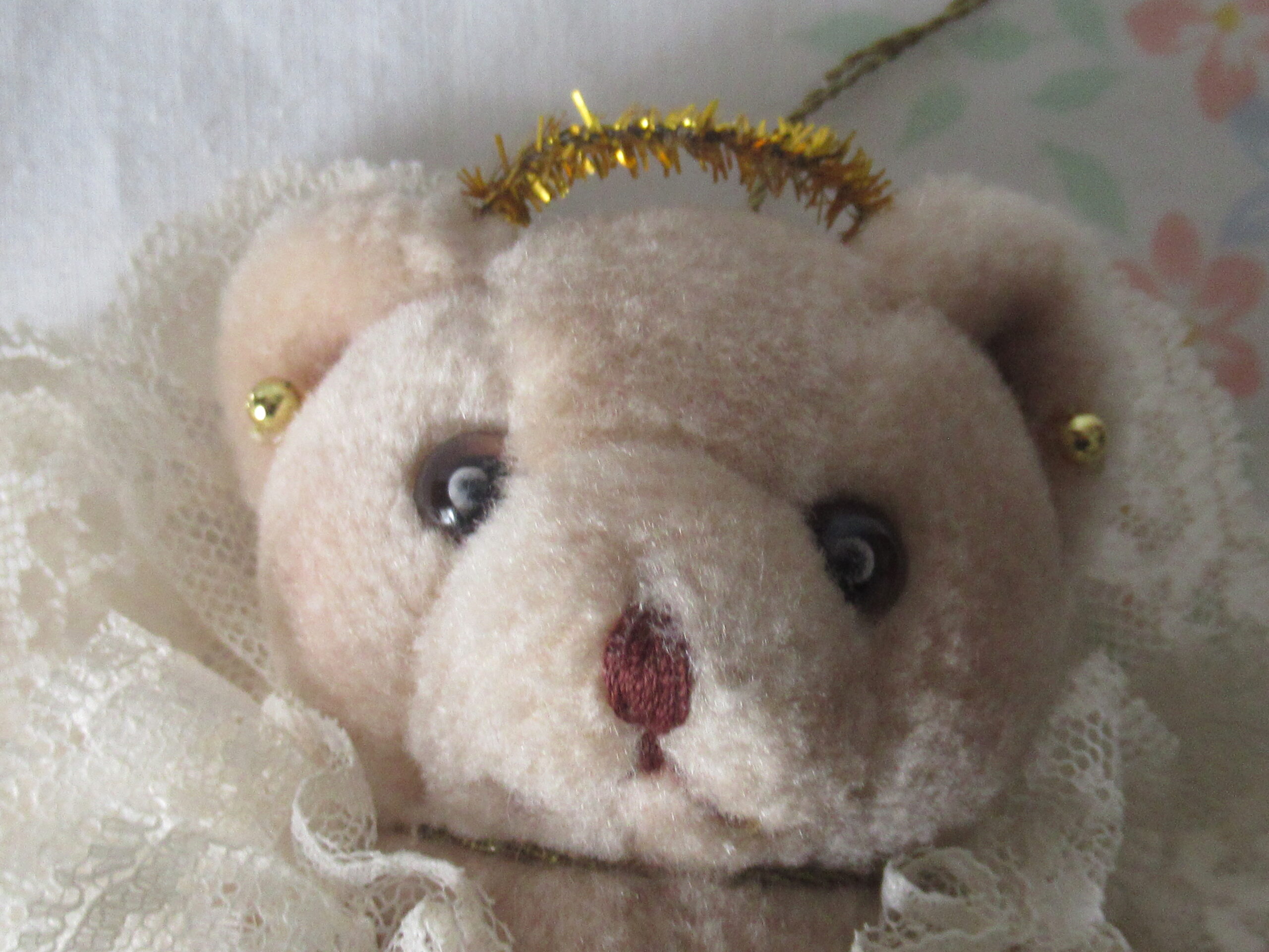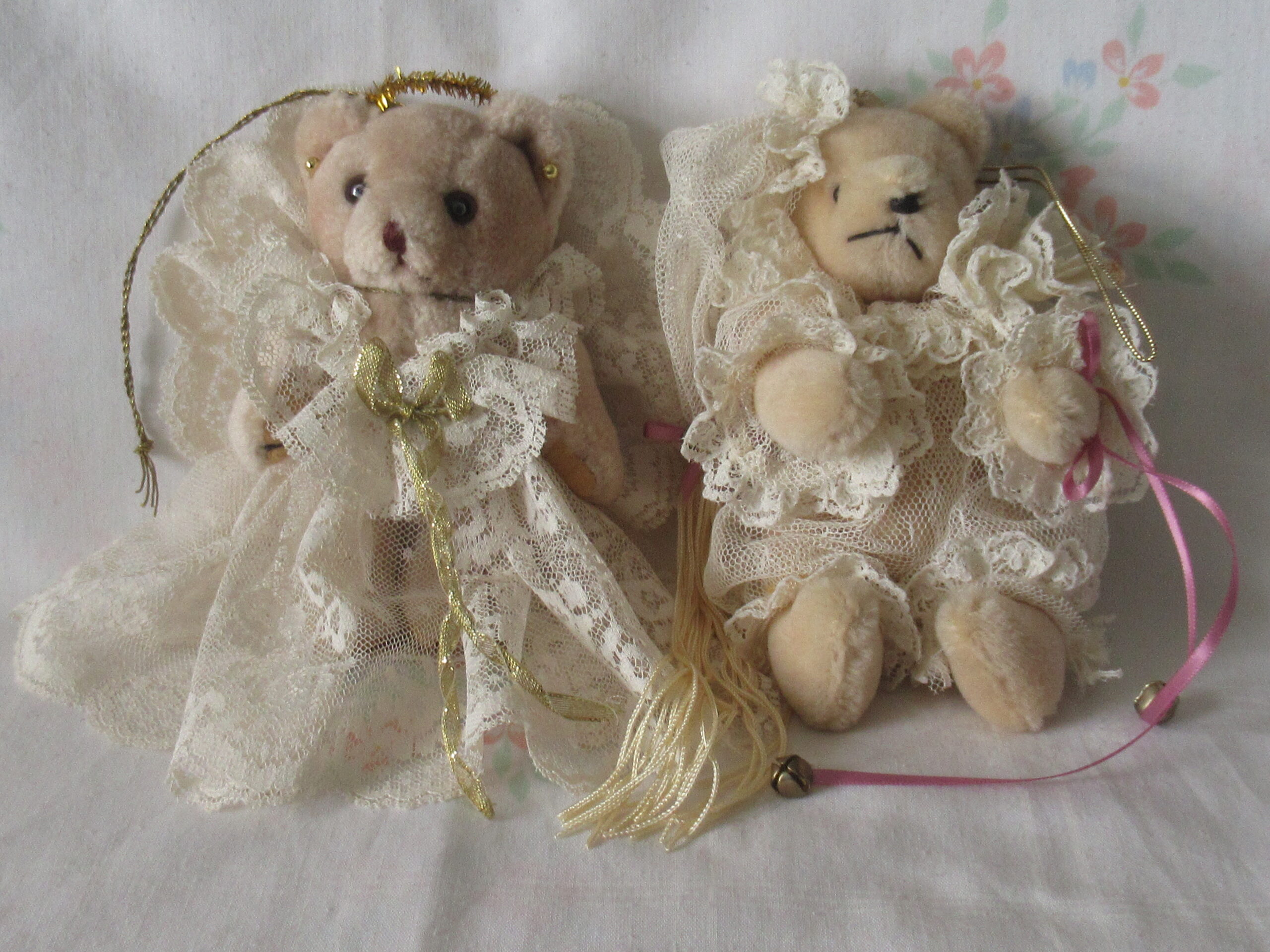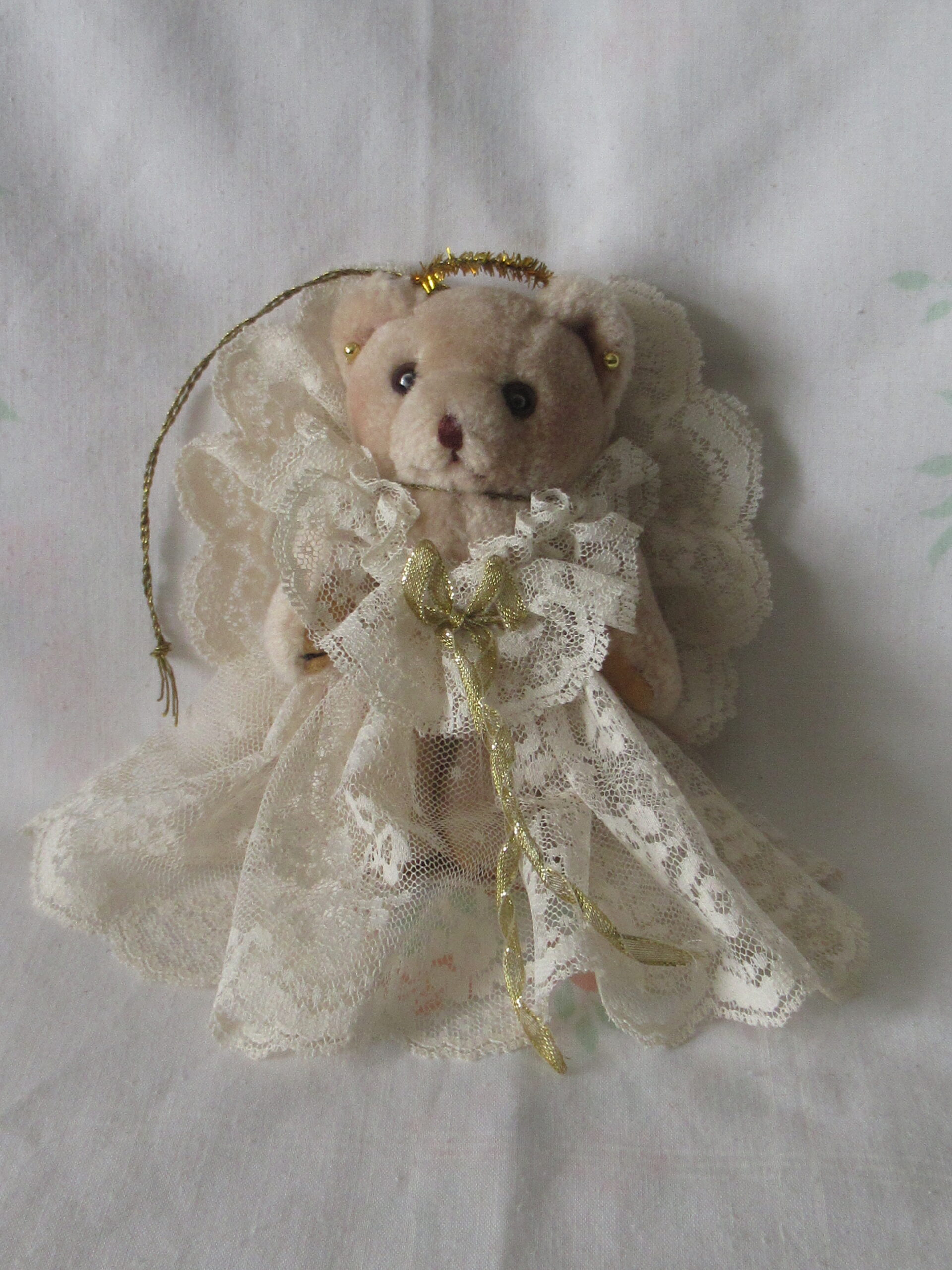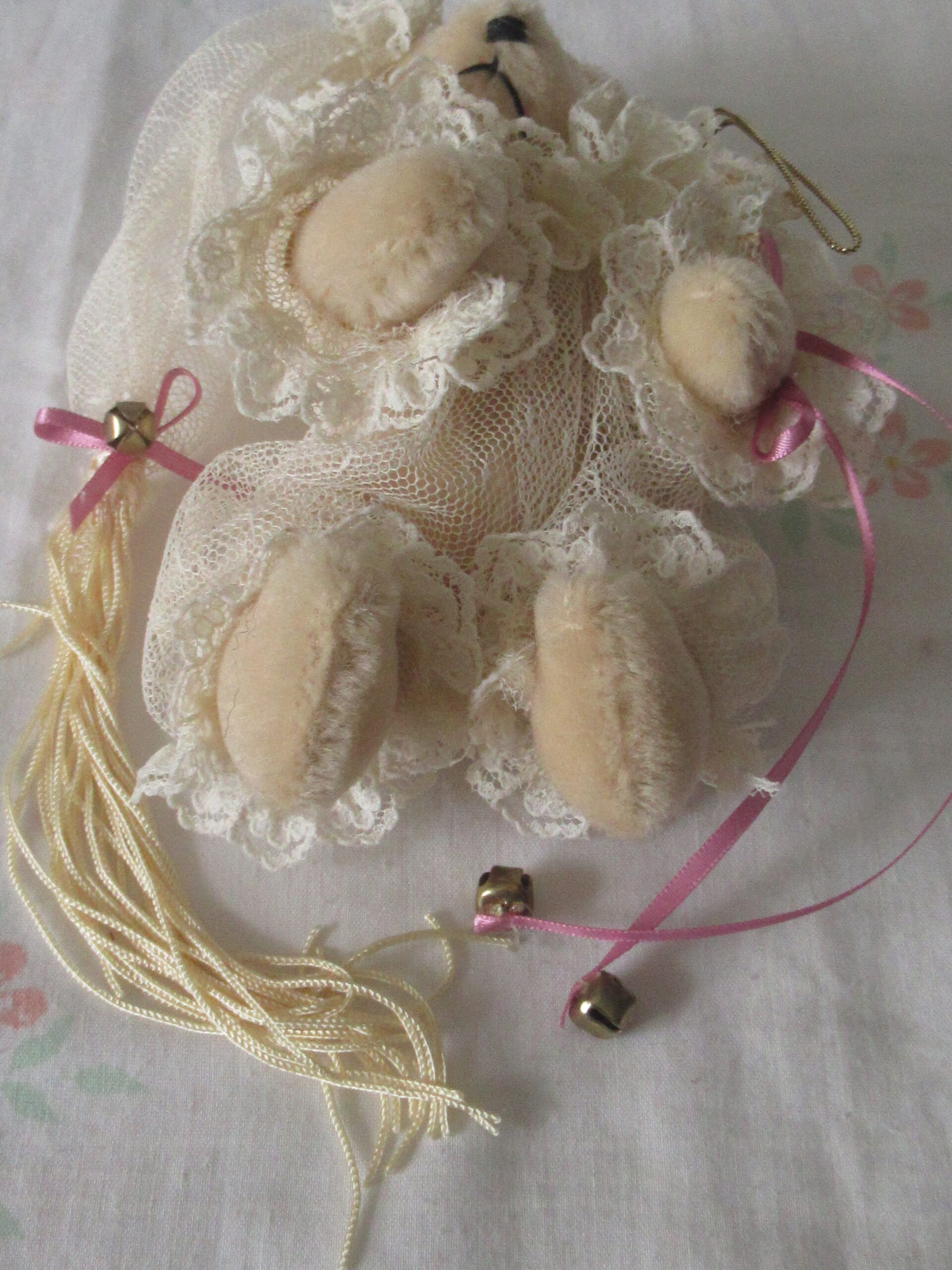 Bear has hanging string attached to head. Head has indentations on rear. Lace appears discolored and elastic is stretched and dried out, especially around neck.