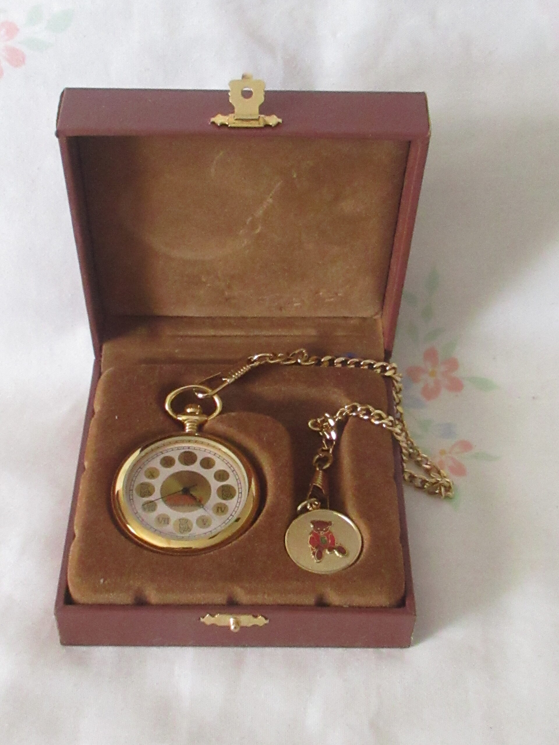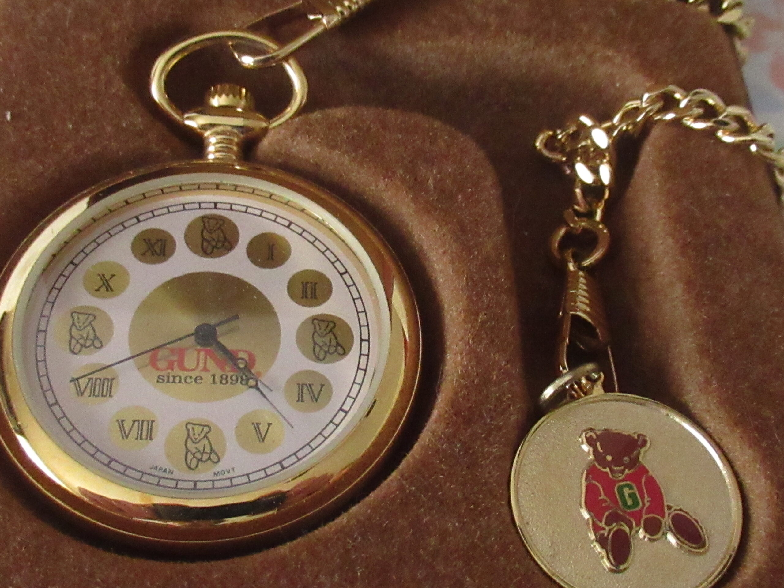 Original Box includes Mohair Teddy Bear, Pocket Watch with individual box, Gund Collectors Club Pin, Envelope with Papers that include Registration Card and Collectible Keepsake Guide. Box, envelope and paper items have dents/creases/soiling/marks.