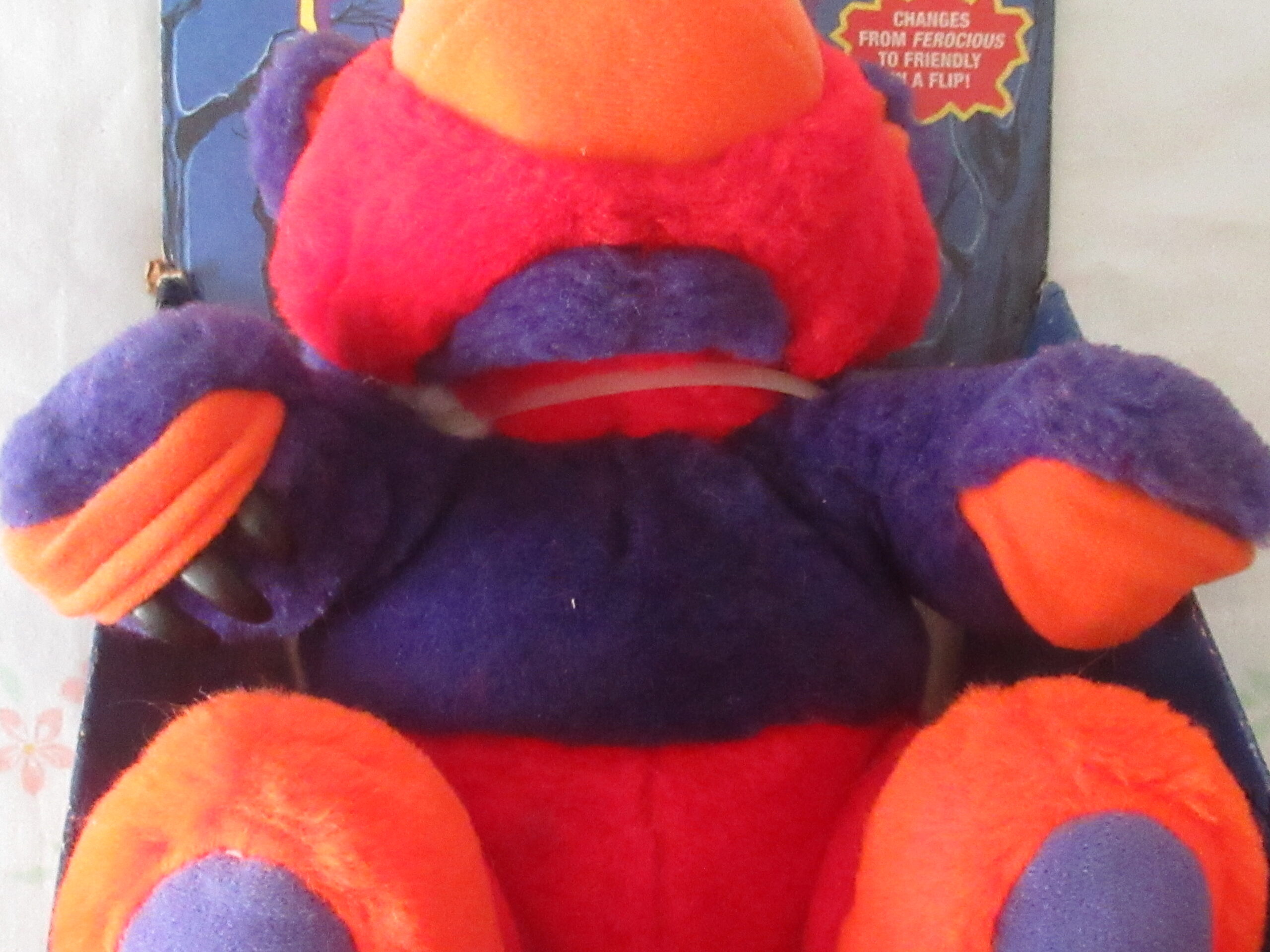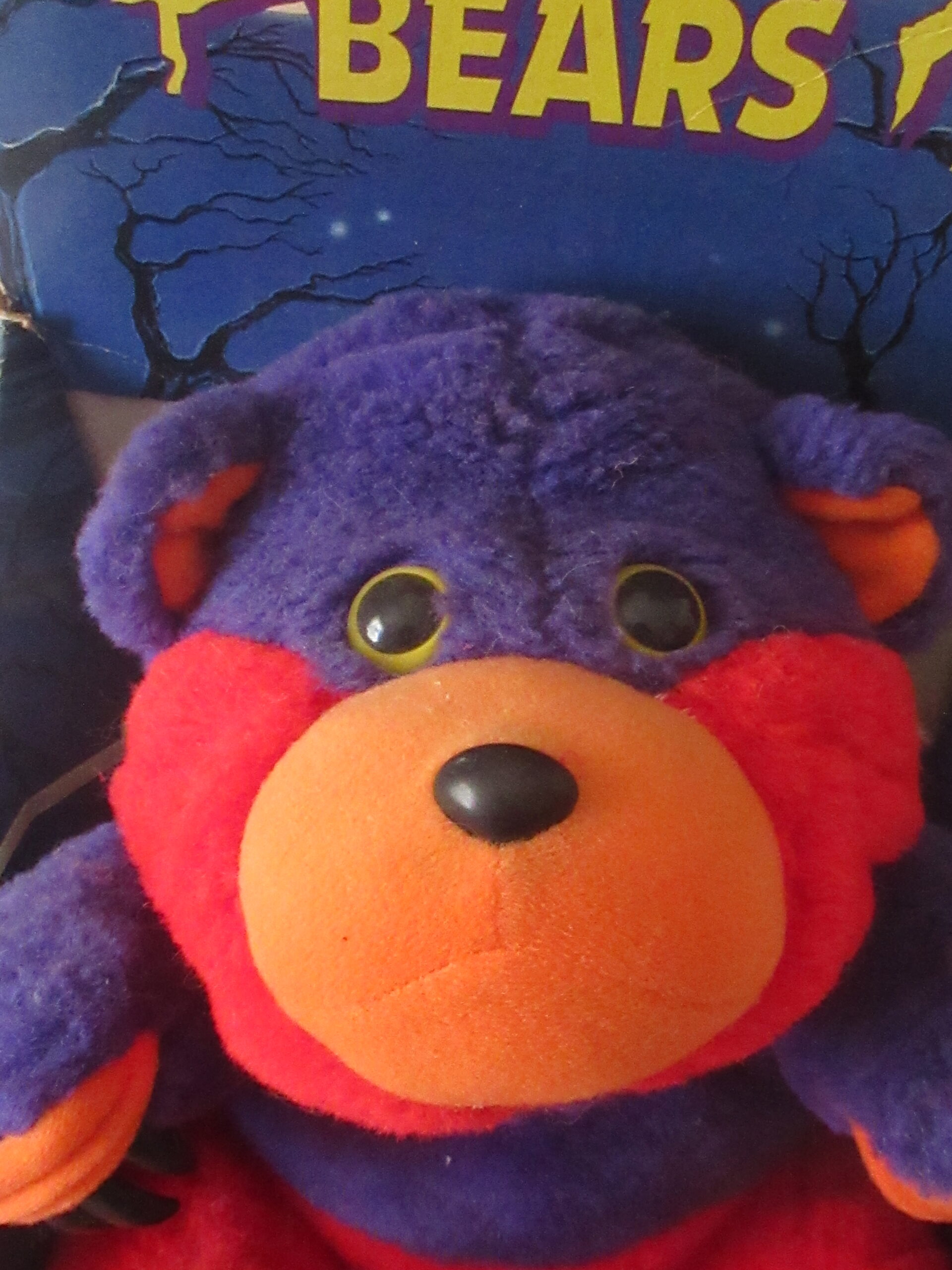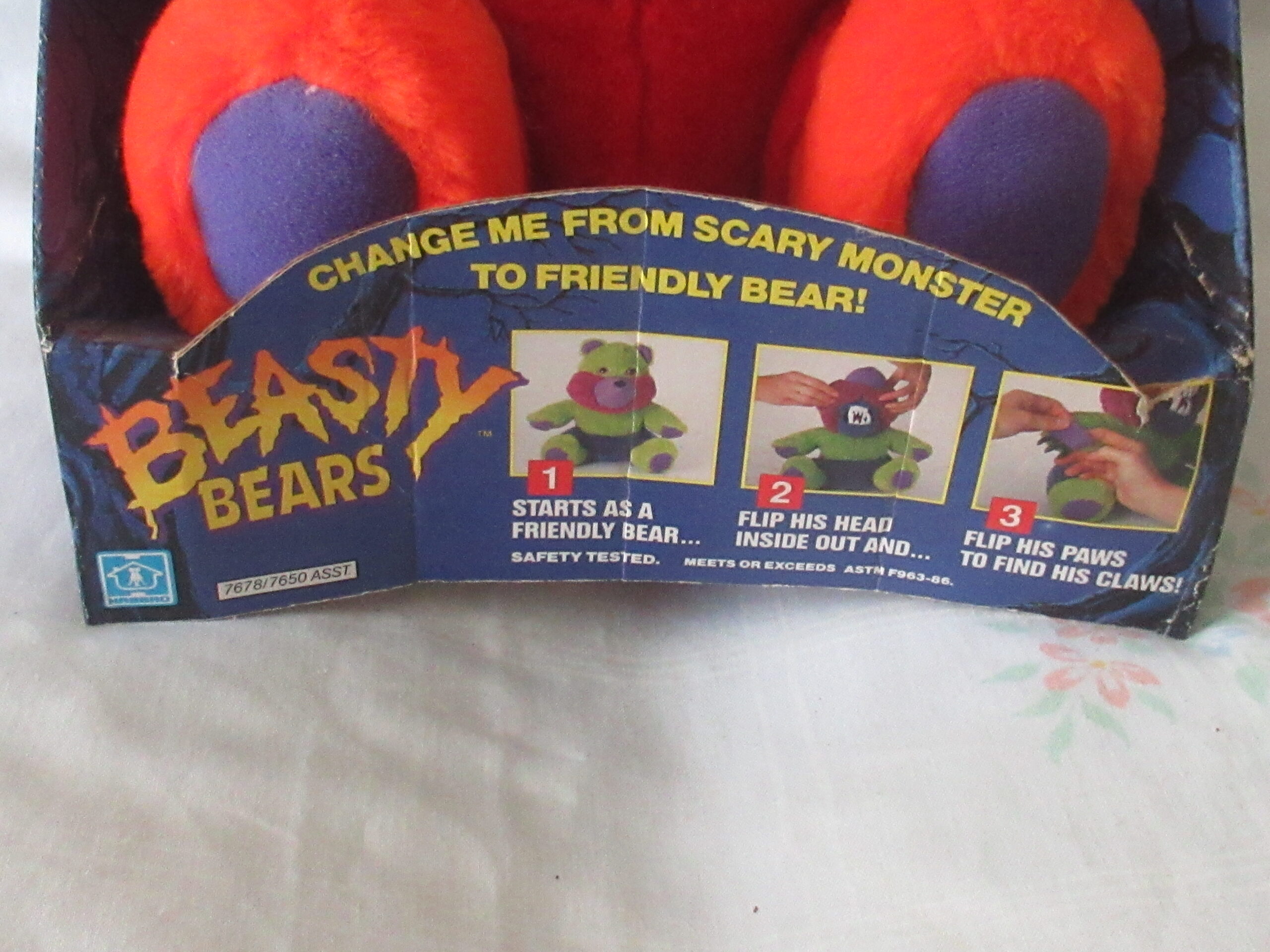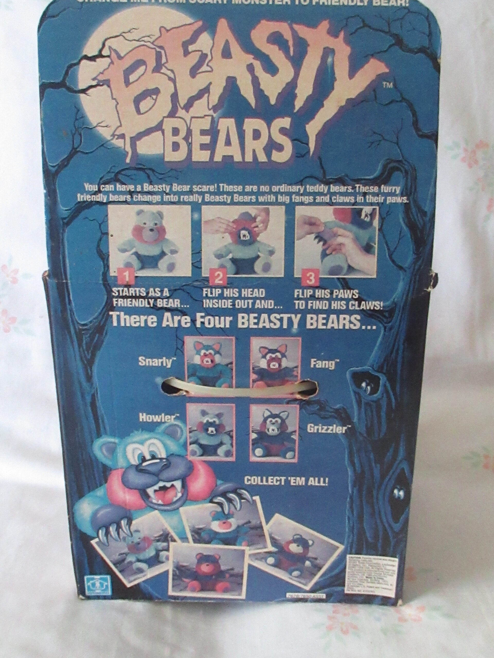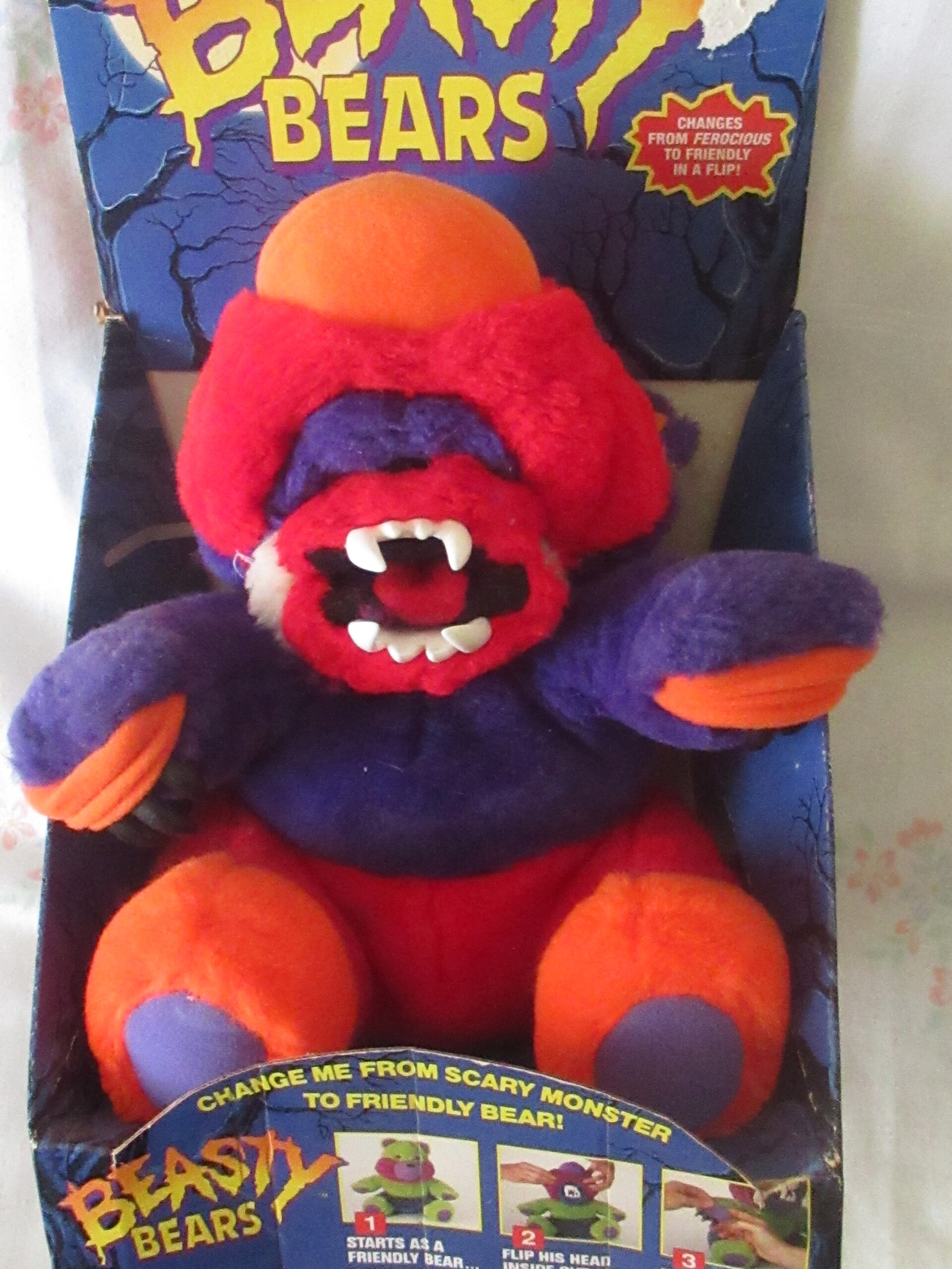 Please note the cardboard presentation package bear is attached to has marks, tears, creases and in small sections the top layer of cardboard removed. Bear is still attached to original cardboard presentation package with a zip tie. Bear does change into a creature with fangs and claws.